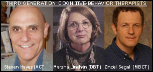 III: Third Wave or Third Generation CBT:Now in 2006 with cognitive behavioral therapy being nearly 50 years old, there is talk of new changes in traditional CBT, a so called "third wave" of cognitive-behavior therapies. While trying to describe all the newer therapies loosely known as third generation CBT's is impossible to do here, let me briefly review some of the main similarities and differences. There are many similarities, third wave CBT therapists base themselves in empirical research, they acknowledge the important role of behavior just as much if not more so than traditional CBT, most also continue to acknowledge the important role of cognitions (thinking). So what is so revolutionary? Some of the main theoretical difference seems to be about control and emotional avoidance. Third wave therapists have sparked a re-examination of whether trying to control our thoughts and emotions is part of the solution or the problem. They believe that there may be other non-traditional ways to address the way we deal to our thinking. This theoretical question has stimulated renewed efforts for cognitive-behavioral therapists to improve their ability to not just work with the content of our thoughts but the process of thinking itself. Another way of saying this is trying not to just change what we think but how we think. Now traditional CT has also tried to do this in its own way, but when it comes to our thoughts, third wave CBT is putting much more emphasis reacting to our thoughts in a new ways, placing them in context, rather than getting caught in arguing with the content our negative thoughts. (For a more technical definition of "3rd generation CBT" see footnote quote 1 below).